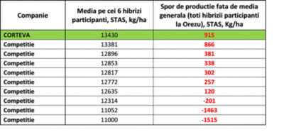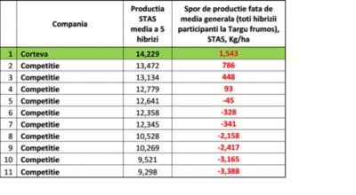 Corteva, in TOP 20, are 4 din cei 6 hibrizi inscrisi in competitie. Daca analizam datele pe media tuturor hibrizilor intrati in competitie pe fiecare companie, situatia se prezinta astfel: