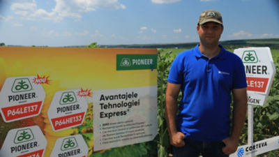 Andrei Ciocoiu: “In portofoliul de floarea soarelui sunt doi hibrizi noi, P64LE136 și P64LE137, hibrizi ce fac parte din tehnologia Express®, cea care ne-a consacrat și care aduce multiple beneficii în ani precum acesta, cu precipitații reduse în prima faza de vegetație. După cum se vede și aici, cultura arată foarte bine, chiar dacă nu a primit în prima fază nici un litru de apă. P64LE136 este un hibrid cu un potențial foarte bun de producție, care a venit în sprijinul lui P64LE99, creat special pentru zonele cu productivitate înaltă la floarea-soarelui. Este un hibrid intensiv, care vrea tehnologie și care va răsplăti pe deplin investiția în cultură. Recomandăm semănarea acestui hibrid acelor fermieri care au terenuri bune, cu fertilitate bună. Îl recomandăm în special fermierilor din estul, vestul și sudul României, nu-l recomandăm în sud-est. În schimb P64LE137, care a venit în portofoliul companiei pentru a-l înlocui pe celebrul P64LE25, se adaptează foarte bine pe terenuri slabe, în zonele cu secetă și arșiță mai severă și valorifică la maxim toate condițiile oferite, chiar și cele mai puțin favorabile pentru această cultură. Are o îmbunătățire a toleranței la secetă și arșiță, are o poziție modificată a calatidiului, total pendulă pentru a proteja producția de semințe și se va observa o îmbunătățire a masei hectolitrice a viitoarei recolte. Este recomandarea noastră principală pentru fermierii care fac agricultură în zone de infestare cu Orobanche.