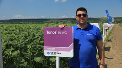 Cosmin Ciobotaru: “Lanul de floarea-soarelui arată foarte bine în condițiile anului extrem de capricios pe care l-am parcurs până în prezent. Aici a fost aplicat produsul Tanos® 50 WG, un produs care se aplică an de an pe aproximativ 125.000 hectare în România. Cei mai mari cultivatori de floarea-soarelui din România nu concep să nu aplice măcar un tratament cu Tanos, a cărui doza de aplicare de este 400 grame/ha, atunci când plantele au 4-6 frunze. Este un produs cu efect preventiv, curativ și de cele mai multe ori și eradicant asupra unor boli problemă din această cultură. Îndemn fermierii care nu au aplicat acest produs să-l încerce, deoarece raportul calitate-preț este imbatabil, iar rezultatele pe care le vor obține vor fi cele mai bune”.