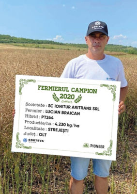 Lucian Braican din localitatea Strejești, județul Olt, a devenit fermier campion în acest an cu hibridul de rapiță PT264. Acesta lucrează 400 ha, în toamna anului trecut a semănat 50 ha cu rapiță, dintre care 15 ha au fost întoarse. “Pe cele 35 ha rămase cu rapiță am obținut 4.230 kg/ha. Cultura a fost înființată după grâu, astfel că terenul a fost arat, apoi am efectuat o trecere cu discul și am administrat 200 kg/ha de îngrășământ complex 18.46.0. Am semănat la finalul lunii august-început de septembrie, însă plantele au răsărit în noiembrie. De aceea nu am administrat nimic în toamnă, ci doar în primăvară. Fertilizarea de primăvară a constat în administrarea a 100 kg/ha de uree și 300 kg/ha de nitrocalcar. Am erbicidat și am aplicat două tratamente cu fungicid, insecticid și foliar, primul în stadiul de 3-5 frunze, iar cel de al doilea atunci când rapița era înflorită în proporție de 3-5%. Chiar dacă a fost un an destul de greu pentru rapiță, am fost foarte mulțumit de rezultatul obținut”, a precizat fermierul campion Lucian Braican. Acesta a mai adăugat faptul că în această toamnă va semăna în jur de 100 ha cu rapiță și va alege exclusiv hibridul PT264.