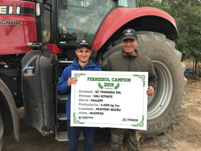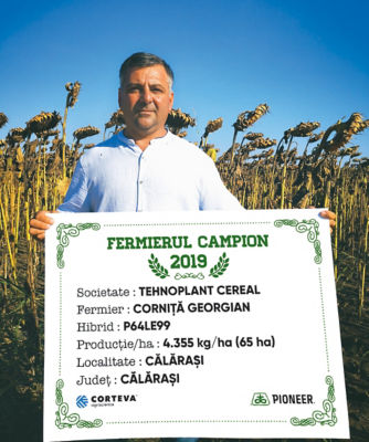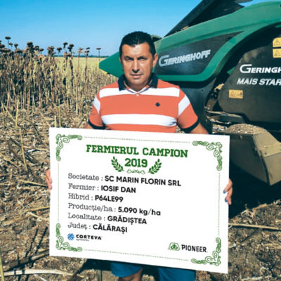 Domnul Georgian Corniță este următorul fermier campion din județul Călărași, acesta a cultivat hibridul P64LE99 pe 65 ha și a obținut 4.355 kg/ha. “Lucrez 700 ha, iar în această campanie floarea-soarelui am semănat pe 200 ha. În funcție de solă, planta premergătoare a fost porumb sau grâu. Acolo unde am avut hibridul P64LE99, planta premergătoare a fost porumbul, așa că lucrarea de bază a solului a fost arătura. Apoi am pregătit terenul cu discul și combinatorul, după aceea, în prima parte a lunii aprilie, am semănat 68.000 b.g/ha și am administrat îngrășământ complex 11.52.0 – 200 kg/ha. Cultura a fost prășită de două ori, iar la prima prașilă am mai dat 80 kg/ha de azot. Am erbicidat cu Express® 50 SG și cu antigramineic, iar în stadiul de 4-6 frunze am aplicat fungicidul Tanos® 50 WG. Campania de recoltat a avut loc la finalul lunii august, a fost chiar un an foarte bun și sunt mulțumit de producție”, a specificat domnul Corniță. Acesta a mai adăugat faptul că în următoarea campanie intenționează să semene floarea-soarelui pe 150 ha și va rămâne fidel hibridului P64LE99, pe care îi cultivă de mai mulți ani și care îi oferă producții constante.