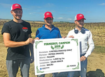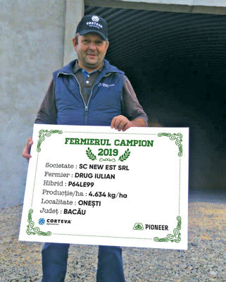 Primul fermier campion din județul Bacău este domnul Iulian Drug, care a ales hibridul P64LE99 și a obținut 4.634 kg/ha. “Lucrez 630 ha, floarea-soarelui am semănat pe 200 ha: pe 100 ha după ce am întors rapița și pe celelalte 100 ha după porumb. 4.634 kg/ha am obținut pe solele unde planta premergătoare a fost porumbul. Am pregătit corespunzător terenul pentru semănat, am fertilizat atunci cu 250 kg/ha de DAP și la prășit am mai dat uree - 250 kg/ha. Cultura a primit și un fertilizant – 3 l/ha, un fungicid și două erbicide. Am recoltat pe parcursul lunii septembrie, a fost un an bun și cred că anul viitor voi semăna tot 200 ha de floarea-soarelui, cu același hibrid P64LE99”, a specificat fermierul campion.