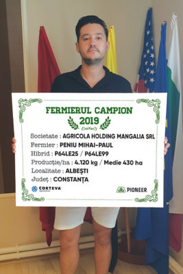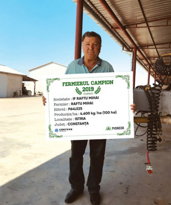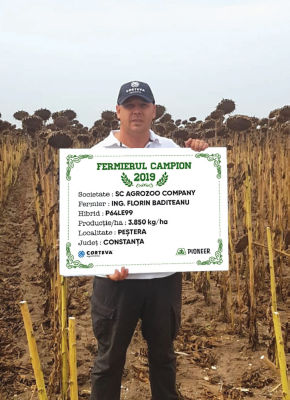 Ionuț Cosmin Constantinescu este primul fermier campion la floarea-soarelui din județul Constanța. Lucrează 230 ha, iar în acest an a semănat 30 ha cu floarea-soarelui, iar datorită hibrizilor P64LE25 și P64LE99 a obținut o producție medie pe fermă de 4.625 kg/ha. “Floarea-soarelui a fost semănată după porumb, de aceea am arat și am discuit. La pregătirea terenului am aplicat 200 kg/ha de uree. În prima parte a lunii aprilie am semănat și am aplicat îngrășământ triplu 15 – 150 kg/ha. Cultura a primit două erbicide, un fungicid și un îngrășământ foliar pe bază de bor – 5 l/ha, iar atunci când am prășit, am aplicat și 150 kg/ha de azotat de amoniu. Recoltatul a avut loc la finalul lunii august, iar în următoarea campanie intenționez să semăn aceeași suprafață cu floarea-soarelui și voi alege hibrizii P64LE99 și P64LE25”, a declarat fermierul campion.