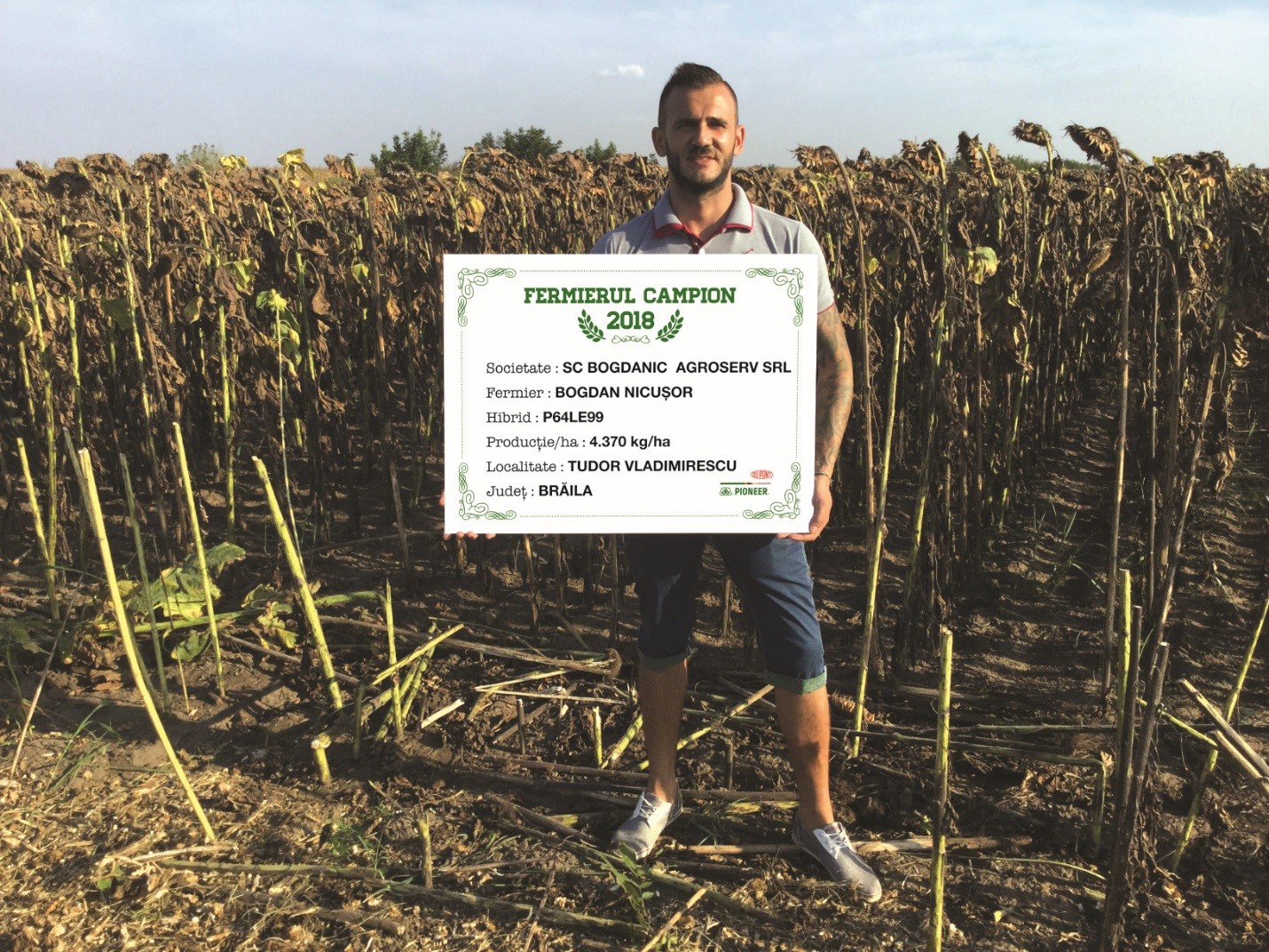 Un alt fermier campion din această zonă a țării este domnul Bogdan Nicușor, care lucrează 380 ha, pe 80 ha a semănat în acest an floarea-soarelui și a obținut cu hibridul P64LE99 - 4.370 kg/ha. “Am semănat floarea-soarelui după grâu, așa că în toamnă am arat la 30 cm, după care în primăvară am trecut o dată cu combinatorul și am semănat în prima decadă a lunii aprilie, atunci când am aplicat și 200 kg/ha complexe 18.46.0. Am mai fertilizat la prășit, în faza de 8-10 frunze, când am aplicat 200 kg/ha de azot. Am aplicat două erbicide, dintre care unul Express, iar înainte de înflorit am aplicat un tratament cu foliar și fungicid. Am recoltat la începutul lunii august și chiar am fost mulțumit, dar și surprins de producție. M-am mai apropiat de 4 tone, dar niciodată nu am depășit această valoare, este clar cea mai bună producție obținută în fermă. Nu am hotărât câte hectare vom semăna anul viitor, depinde cum evoluează campania de toamnă, probabil vor fi în jur de 100 ha. Voi alege hibridul P64LE99, dar și hibrizi noi pe care i-am avut în loturi demonstrative în acest an”, a specificat Bogdan Nicușor.