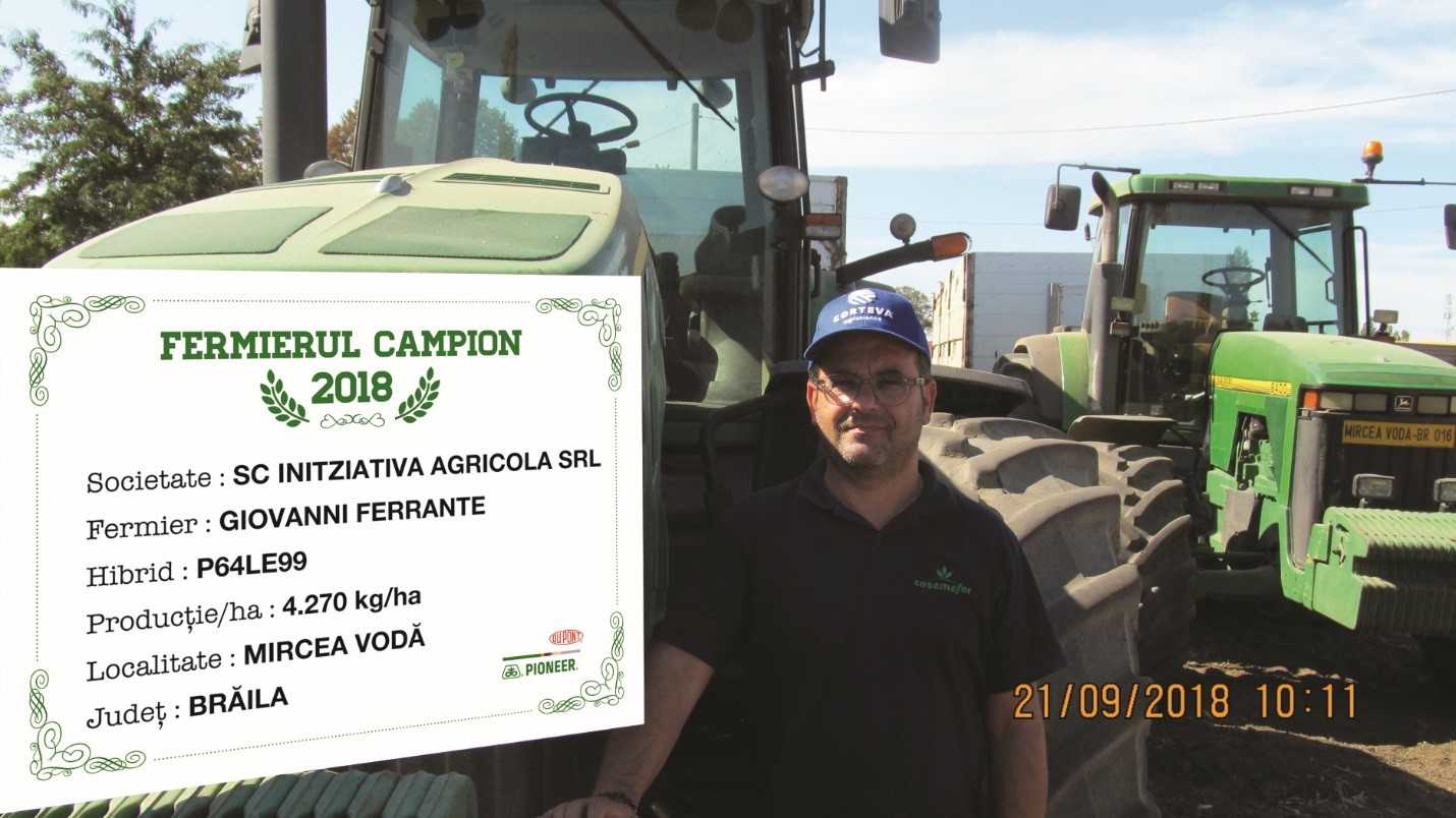 În cadrul societății agricole Initziativa Agricolă, domnul Ferrante Giovani lucrează 818 ha, floarea-soarelui a semănat în acest an pe 221 ha, dintre care 105 ha cu hibrizi Pioneer. Cea mai mare producție i-a asigurat-o P64LE99 - 4.270 kg/ha. În acest an floarea-soarelui am semănat fie după grâu, fie după porumb. Așa că acolo unde a fost grâu am scarificat cu un utilaj mai complex, unde a fost porumb am arat și am trecut o dată cu combinatorul. În primăvară am mai trecut o dată cu combinatorul și am aplicat 150 kg/ha de îngrășăminte complexe 18.46.0. Apoi am semănat în a doua decadă a lunii aprilie, am fertilizat din nou în faza de 8 frunze. Am aplicat 2 erbicide, nu am aplicat tratamente și nici nu am irigat. Am recoltat în jurul datei de 10 septembrie și am fost mulțumit de producție. De aceea și anul viitor voi semăna hibridul P64LE99”, a punctat fermierul campion.