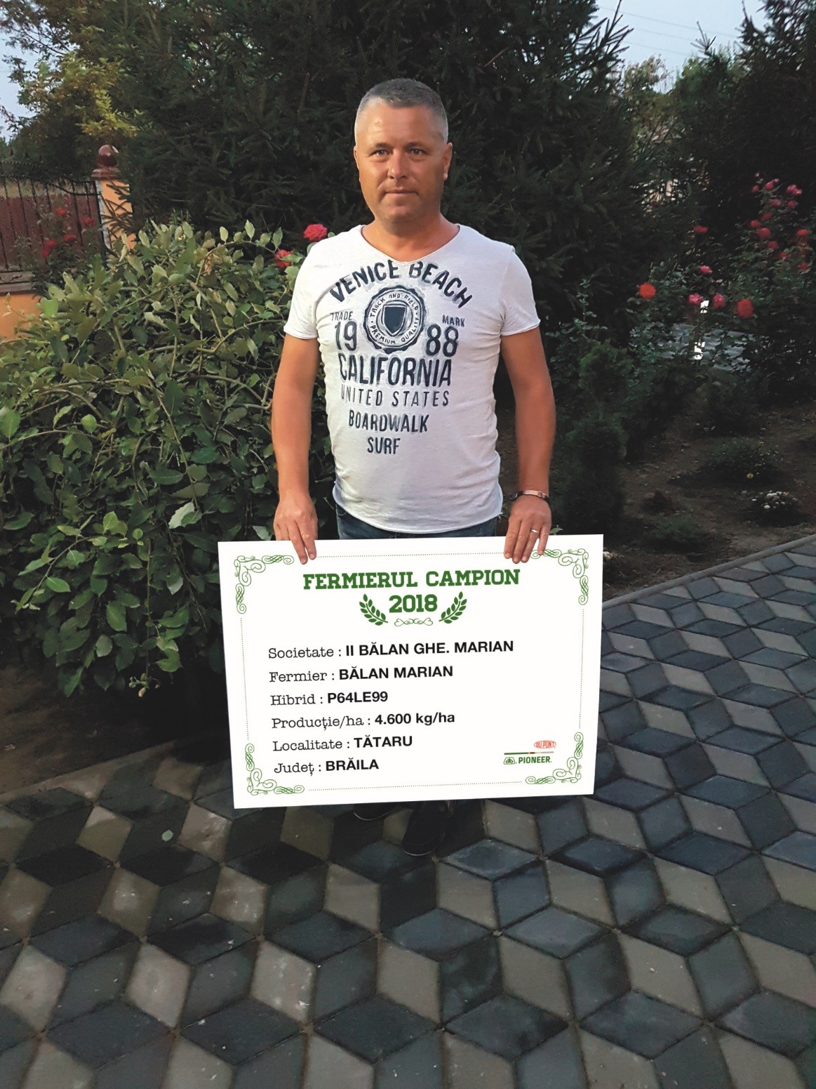 În localitatea Tătaru - județul Brăila, fermierul cu cea mai mare producție – 4.600 kg/ha, obținută cu hibridul P64LE99 este domnul Marian Bălan. “Lucrez 156 ha, iar în acest an floarea-soarelui am avut pe 70 ha. Am semănat cu porumb și grâu, iar în ceea ce privește tehnologia de cultură, am aplicat 200 kg/ha – complexe triplu 16, am aplicat câte un erbicid, un fungicid și un foliar și am prășit o singură dată. Sunt foarte mulțumit de acest hibrid, îl semăn de mai mulți ani, în jur de 5, iar anul viitor tot acest hibrid îl voi semăna pe 70 ha”, a declarat fermierul campion.