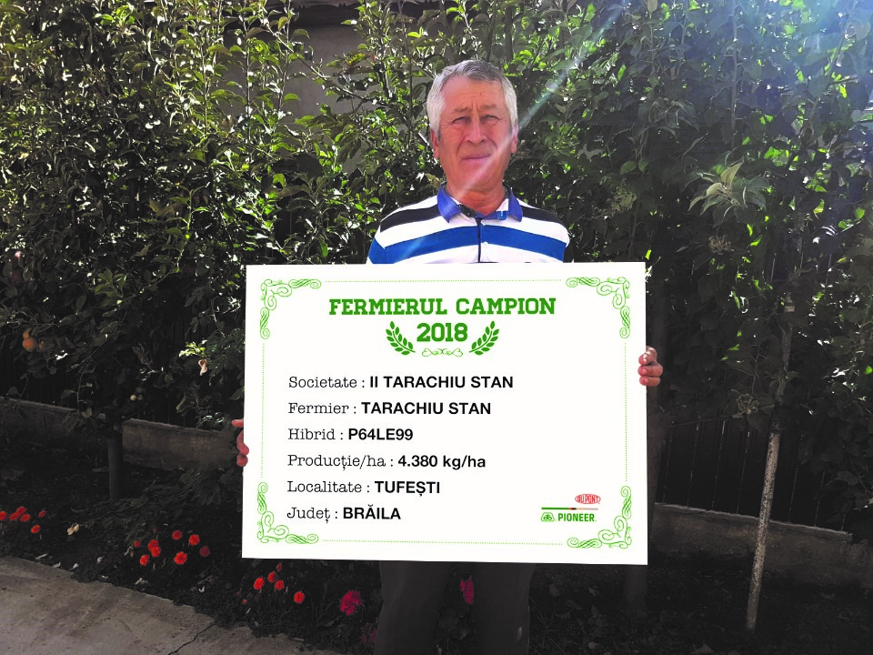 Un alt fermier campion din județul Brăila este Tarachiu Stan, care a obținut 4.380 kg/ha cu hibridul P64LE99. Acesta lucrează în fermă 128 ha, iar floarea-soarelui a avut în acest an pe 50 ha. “În toamnă curățăm terenul, arăm toamna la 30-35 cm, iar primăvara am trecut de două ori cu combinatorul. La semănat, în prima decadă a lunii aprilie, am aplicat și 250 kg/ha complexe 18.46.0, am semănat devreme și am recoltat devreme, adică între 25 august și 3 septembrie. I-am dat culturii un erbicid și un tratament cu foliar și fungicid, atunci când plantele aveau în jur de 30 cm. Cultura este în neirigat și nici nu am prășit-o. Am fost mereu mulțumiți de producțiile obținute cu hibrizii Pioneer, nu ne schimbăm pe altă firmă pentru nici un motiv”, a declarat fermierul campion. Aceasta a mai adăugat faptul că în următoarea campanie va semăna 50 ha cu hibridul P64LE99.