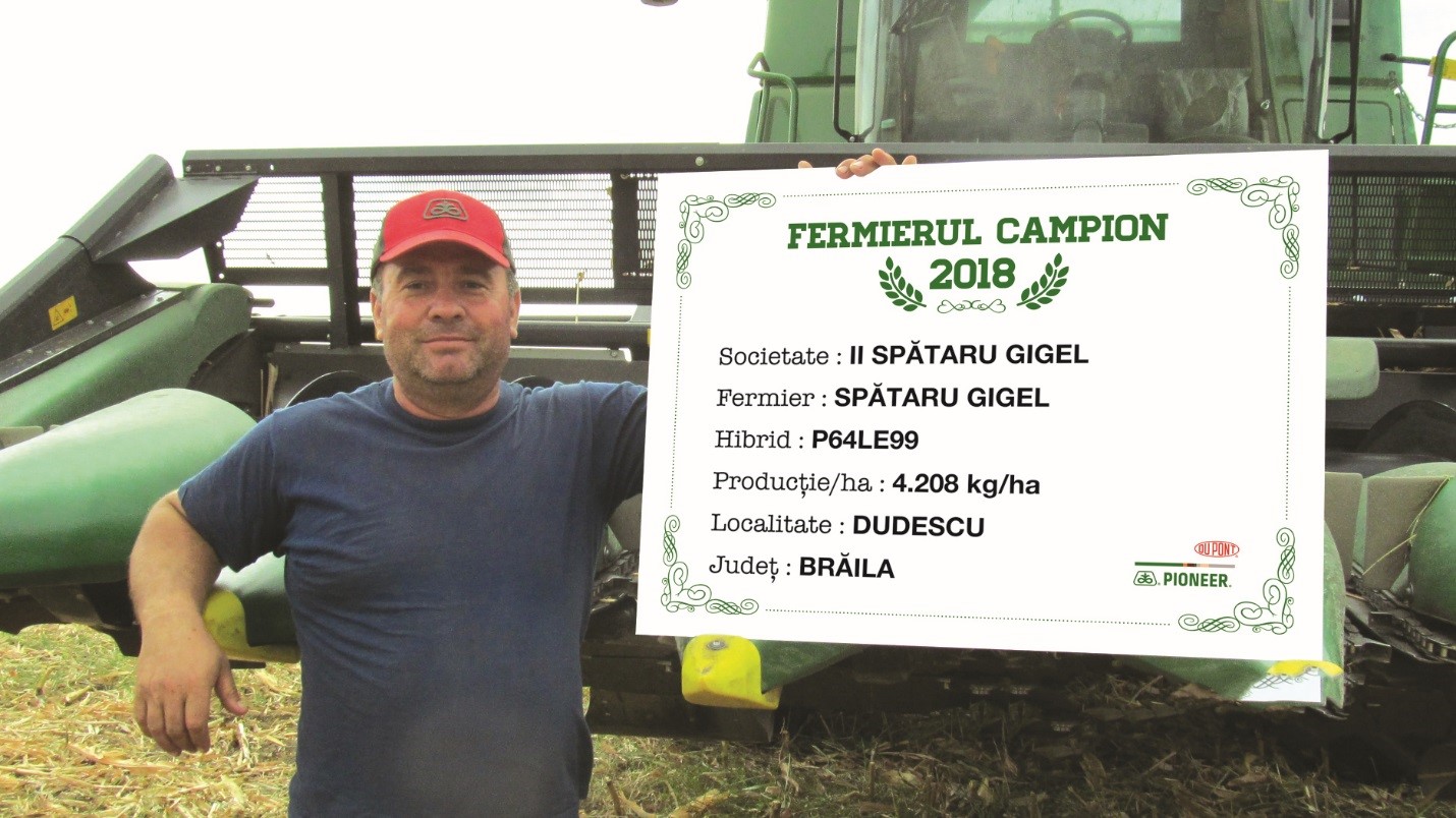 Gigel Spătaru din localitatea Dudescu lucrează 79 ha, iar floarea-soarelui a avut pe 8 ha. Acesta a devenit fermier campion cu producția de 4.208 kg/ha, obținută cu P64LE99. “Am semănat floarea-soarelui după porumb, în toamnă am arat la 35 cm și am fertilizat cu 11.52.0 – 200 kg/ha. În primăvară am efectuat o trecere cu discul și una cu combinatorul, la semănat la sfârșitul lunii aprilie, atunci când am mai aplicat 200 kg/ha de complexe 20.20.0. Cultura a mai primit două erbicide, încă o fertilizare cu 200 kg/ha de azot în faza de 10-12 frunze a culturii, am irigat 10 ore cu coloană clasică. Am recoltat la finalul lunii august, iar anul viitor voi semăna 10 ha cu hibridul P64LE99”, a declarat fermierul brăilean.