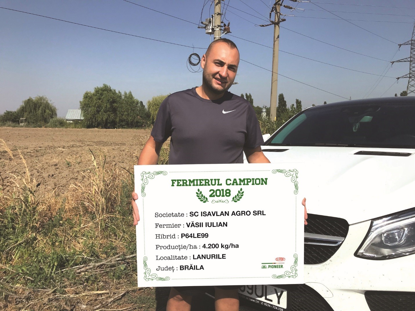 În localitatea Lanurile, județul Brăila, fermier campion a devenit domnul Iulian Văsii, care a obținut 4.200 kg/ha datorită hibridului P64LE25. Acesta lucrează 300 ha, iar floarea-soarelui a cultivat în acest an pe 60 ha, toată suprafața fiind semănată cu cei doi hibrizi de top P64LE25 și P64LE99. “Am semănat floarea-soarelui după grâu și porumb, astfel că am arat în toamnă, apoi în primăvară am trecut cu discul și înainte de semănat cu combinatorul. Am semănat în data de 13 aprilie, atunci când am aplicat și 150 kg complexe 20.20.0. Cultura a mai primit un foliar, două tratamente, două erbicide și o prașilă. Sunt mulțumit de producție, am putut recolta după 20 august, iar acești doi hibrizi îi semăn de când au apărut”, a spus fermierul campion.