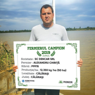 Următorul fermier campion din județul Călărași este domnul Alexandru Chiriță, care a obținut 12.350 kg/ha cu hibridul P9978. “Lucrăm 2.800 ha, dintre care 900 au fost semănate cu porumb. Hibridul P9978 a fost semănat pe sole unde doi ani consecutiv am fost soia. În toamnă am arat la 35 cm, în primăvară am pregătit terenul, în primăvară am fertilizat pe rând, iar densitatea pe care am mers a fost de 75.000 b.g/ha. Am administrat un erbicid preemergent, apoi încă două erbicide, într-o singură trecere. Cultura a primit un insecticid, iar la prășit, în stadiul de 6-8 frunze, am fertilizat cu azot – 200 kg/ha. Am recoltat începând cu 12 septembrie. În următoarea campanie voi semna în jur de 800 ha cu porumb, jumătate cu hibrizi Pioneer, am ales în general hibrizi noi. Hibridul P9978 îl voi semăna pe 240 ha, mi-a plăcut cel mai mult și mi-a oferit cea mai bună producție din fermă”, a punctate Alexandru Chiriță.