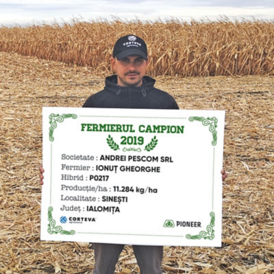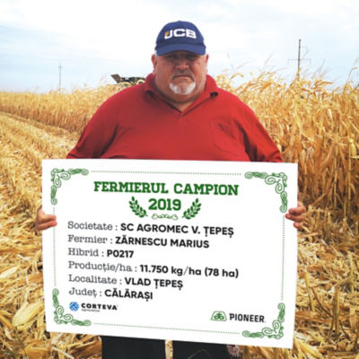 Marius Zărnescu a devenit și el fermier campion în județul Călărași. A semănat 736 ha cu porumb doar cu hibrizi Pioneer®, iar cea mai bună producție i-a oferit-o hibridul P0217 – 11.750 kg/ha. “Lucrez 1.700 ha, iar cultura premergătoare pentru porumb a fost grâul. Astfel că am dezmiriștit, am fertilizat cu 250 kg/ha de îngrășământ complex 18.46.0, după care am arat. Mai apoi am aplicat uree - 250 kg/ha și am pregătit terenul cu combinatorul. Semănatul a avut loc începând cu data de 10 aprilie, densitatea pentru care am optat a fost de 72.000 b.g/ha, atunci am mai administrat îngrășământ 8-30-0, 100 kg/ha. Am erbicidat, unul dintre erbicide a fost Titus Plus și cultura a fost prășită în stadiul de 8-10 frunze. Aceasta a fost tehnologia pentru hibridul P0217. Am recoltat în luna septembrie, însă în irigat tehnologia a fost alta și am obținut rezultate mai bune, chiar și 17 tone/ha”, a specificat agricultorul. Acesta a mai adăugat faptul că în următoarea campanie va semăna în jur de 600 ha cu porumb, doar cu hibrizi Pioneer®.