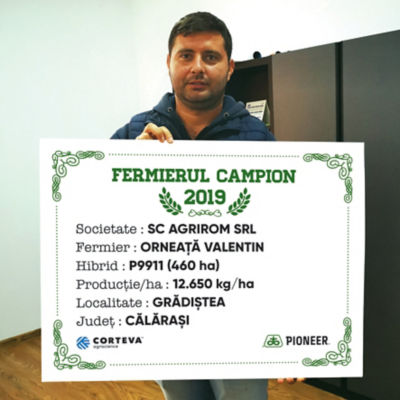 Primul fermier campion din această zonă este Valentin Orneață din localitatea Grădiștea, județul Călărași, care a cultivat hibridul P9911 și a obținut 12.650 kg/ha. „Lucrez 4.065 ha, iar porumb am avut anul acesta pe 1.047 ha. Cea mai bună producție am obținut-o cu hibridul P9911 – 12.650 kg/ha, iar media în fermă a fost de 11.835 kg/ha. La acest hibrid plantă premergătoare a fost porumbul, astfel că terenul a fost scarificat la 45 cm și discuit în primăvară. Am fertilizat cu îngrășământ complex - 200 kg/ha, am semănat la începutul lunii aprilie 78.000 b.g/ha, iar după semănat am aplicat azot lichid. Cultura a primit două erbicide, unul preemergent și postemergent. Am recoltat pe 9-10 septembrie și am fost mulțumit de producții, chiar a fost un an mai bun. În ceea ce privește următoarea campanie, voi semăna mai mulți hibrizi Pioneer, printre care P9911 și P0217”, a declarat fermierul campion.