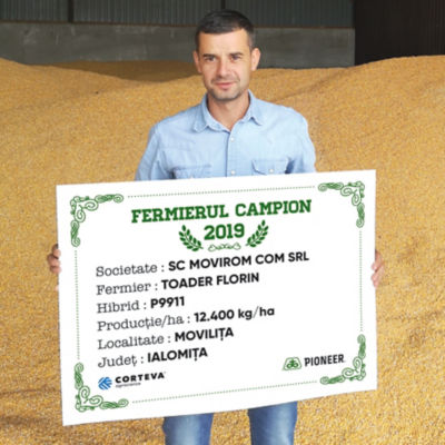 În județul Ialomița, primul fermier campion este domnul Florin Toader. Acesta lucrează 900 ha, iar porumb a cultivat în acest an pe 220 ha. Hibridul P9911 i-a asigurat 12.400 kg/ha, un hibrid pe care îl cultivă de mai mulți ani, iar anul acesta i-a oferit cea mai bună producție din fermă. „Acest hibrid a fost semănat după rapiță, astfel că terenul a fost arat, în primăvară am fertilizat cu azot– 250 kg/ha, apoi am discuit. Am semănat la începutul lunii aprilie, densitatea de 72.000 b.g/ha, și atunci am fertilizat cu îngrășământ complex 18.46.0 – 250 kg/ha. Cultura a primit două erbicide, iar atunci când am administrat al doilea erbicid am dat și un îngrășământ foliar, asta atunci când plantele aveau 6 frunze. Nu am prășit cultura și nu am mai administrat nimic altceva”, a punctat agricultorul. Acesta a mai adăugat faptul că în următoarea campanie va semăna în jur de 200 ha cu porumb și va alege cu siguranță hibridul P9911, pentru că este un hibrid stabil, l-a cultivat timp de 4 ani, iar în 3 ani a fost cel mai performant hibrid din fermă.