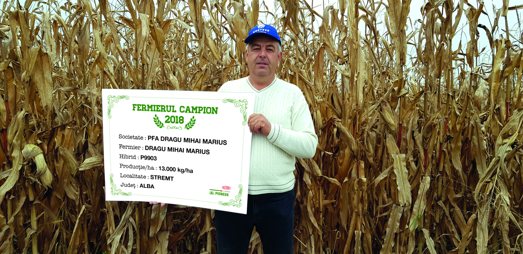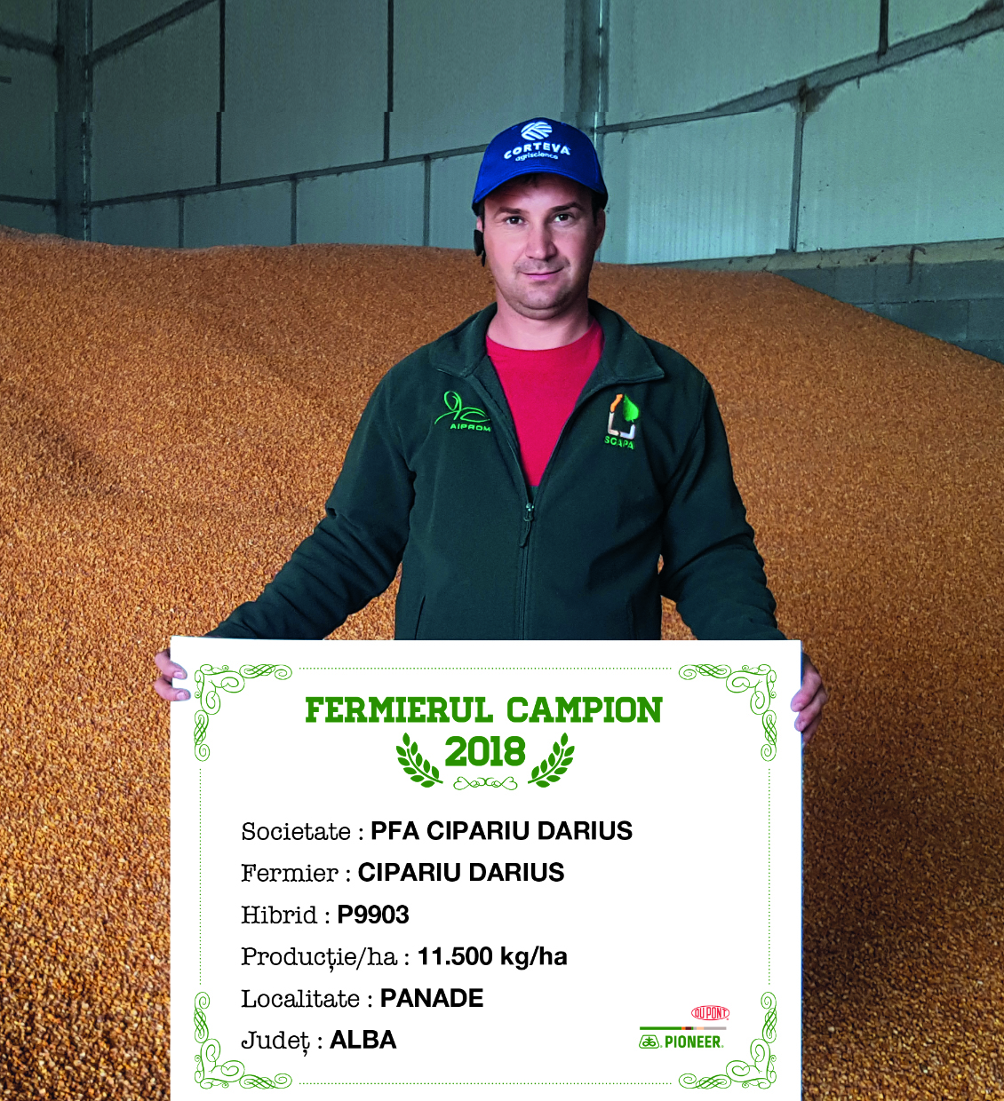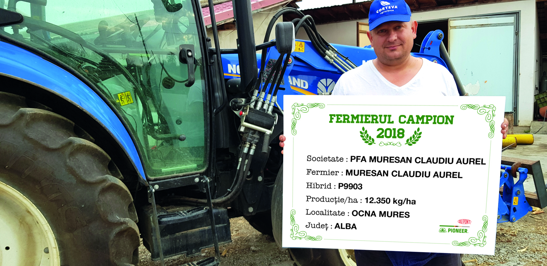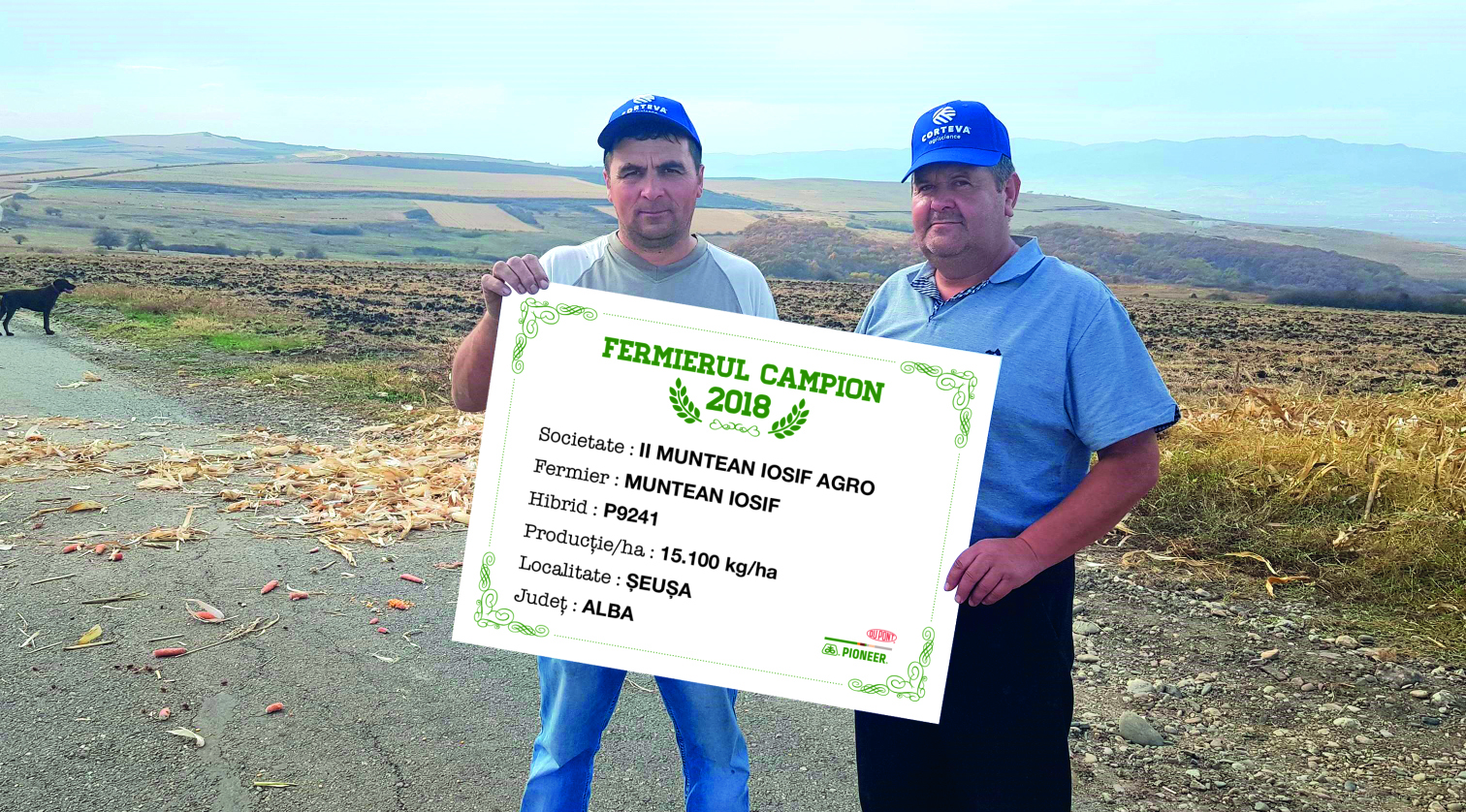 În județul Alba primul fermier campion este Iosif Muntean care a semănat hibridul P9241 și a obținut 15.100 kg/ha. “Lucrez 300 ha, iar porumb am avut pe 200 ha și am semănat în principal după floarea-soarelui, grâu și lucernă. În toamnă am scarificat și am aplicat gunoi de grajd, pentru că eu am și o fermă de vaci. În primăvară am continuat lucrările, așa că am intrat cu freza apoi am semănat la jumătatea lunii aprilie. La semănat am aplicat îngrășăminte 20.20.0 - 350 kg/ha, iar în vegetație am mai aplicat azotat – 150 kg/ha. Erbicide am aplicat în două tranșe, unul după semănat și cel de al doilea a fost de corecție. Nu am aplicat nici un fel de tratament și nici nu am prășit, iar campania de recoltat am început-o în luna octombrie. În primăvară voi semăna tot în jur de 200 ha, aceeași hibrizi Pioneer, poate și ceva nou. Anul acesta a fost de excepție, pentru toți hibrizii, iar la hibrizii Pioneer s-a văzut diferența, în plus spun, deci am fost mulțumit”, a punctat agricultorul.