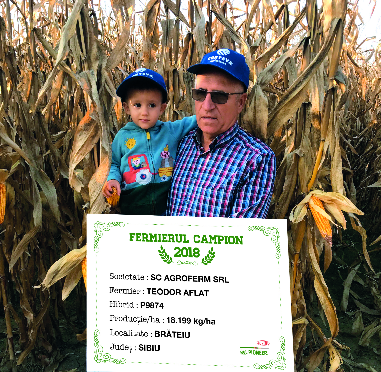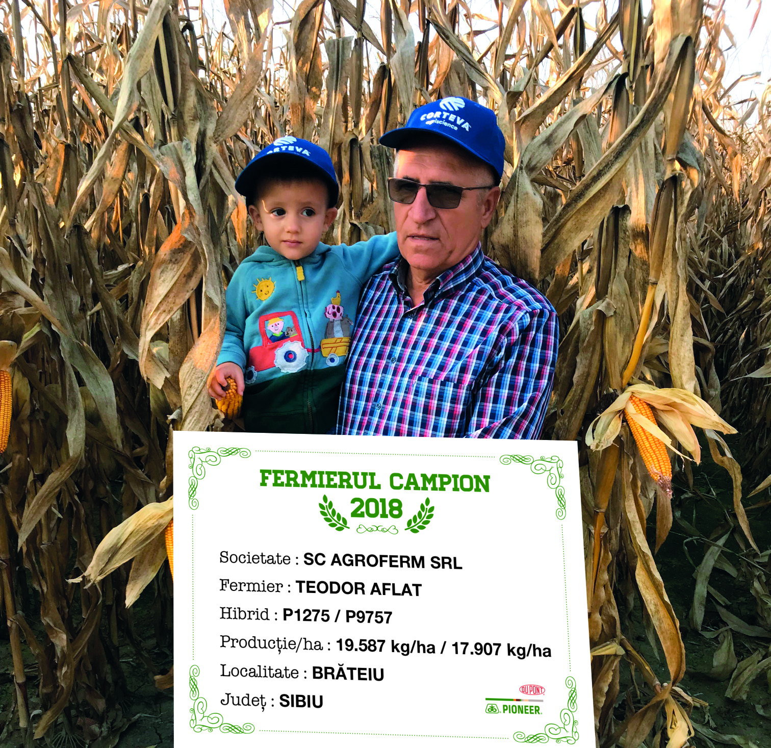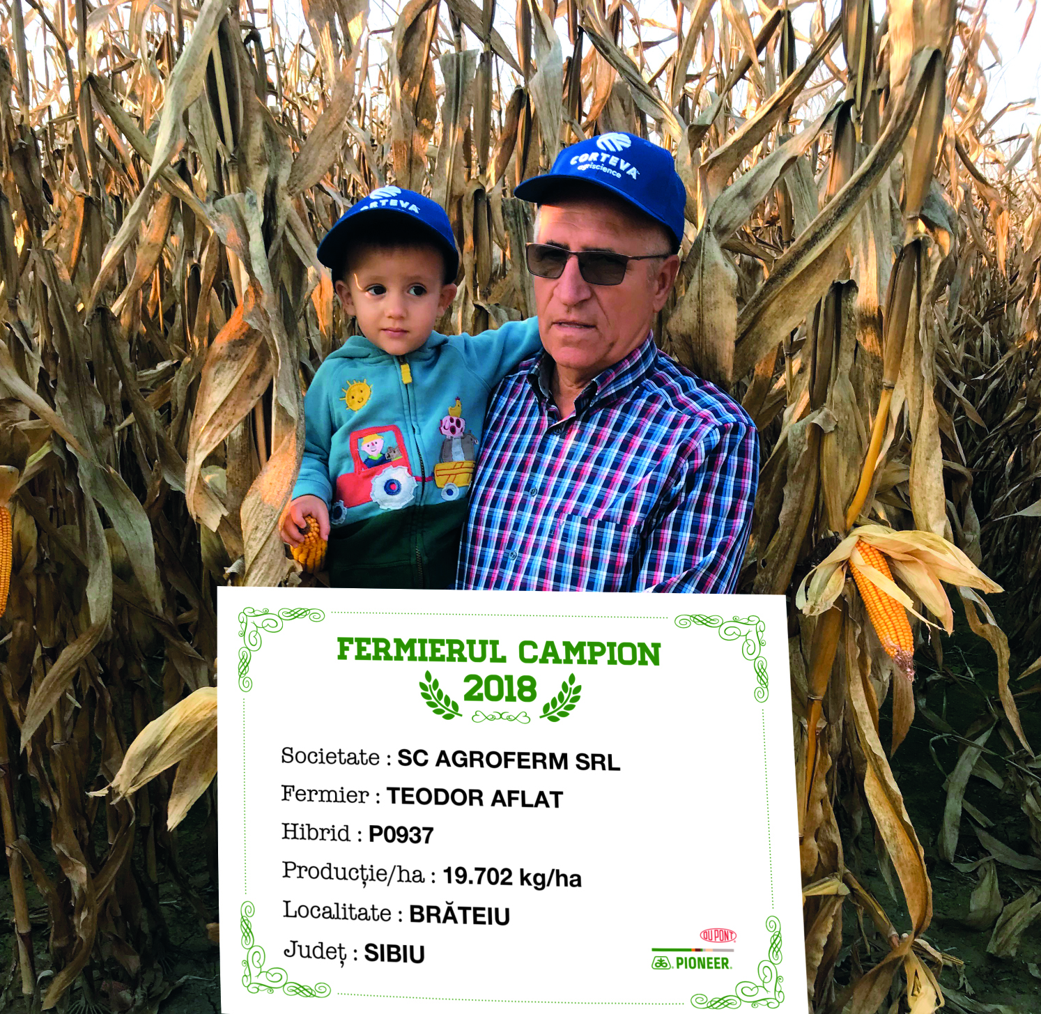 În acest an unul dintre fermierii care a avut cele mai bune rezultate cu hibrizii Pioneer este domnul Teodor Aflat din localitatea Brateiu, județul Sibiu. Cea mai mare producție a obținut-o cu hibridul P0937 – 19.702 kg/ha, următorul hibrid din top a fost P1275 – 19.587 kg/ha, urmat de P9874 - 18.199 kg/ha și P9757 – 17.907 kg/ha. “Lucrez în jur de 8.000 ha, dintre care anul acesta 1.950 ha au fost semănate cu porumb. Pe unele parcele am obținut producții foarte bune, chiar excepționale, așa cum reiese și din fotografii. Principalele culturi după care am semănat au fost grâul, sfecla și am semănat chiar și după porumb. Lucrările pentru pregătirea terenului le-am început din toamnă și astfel am scarificat sau arat, a depins de solă, pot spune că jumătate din suprafață a fost arată, jumătate scarificată. În primăvară am lucrat terenul cu grapa și am început campania de semănat pe data de 9 aprilie. Am fertilizat 150 kg/ha de îngrășăminte complexe 18.46.0, am aplicat și uree în două tranșe, în total 250 kg/ha. Am aplicat în luna mai un îngrășământ foliar cu zinc, iar în ceea ce privește erbicidele am aplicat fie unul singur, fie două unde a fost cazul. Jumătate din suprafață a fost prășită, iar campania de recoltat a debutat în data de 2 septembrie. A fost un an bun, cu producții bune, de aceea voi semăna porumb anul viitor pe aproximativ 2.000 ha și voi alege cu siguranță aceeași hibrizi Pioneer”, a declarat fermierul campion.