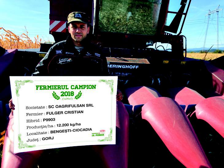 Alin Ancuța este primul fermier campion din județul Vâlcea. Acesta a semănat hibridul P9911 și a obținut 13.580 kg/ha. “Anul trecut am lucrat 1.300 ha, însă am crescut suprafața la 2.000 ha. Am avut 200 ha de porumb și am semănat după orz, rapiță sau grâu. Astfel că am arat sau scarificat, în funcție de solă și planta premergătoare. În primăvară am fertilizat cu triplu 15 - 250 kg/ha și uree - 200 kg/ha, după care am efectuat o lucrare cu discul. Am semănat în jur de 70.000 b.g/ha în prima decadă a lunii aprilie. Am erbicidat toată suprafața o singură dată, iar unde a fost cazul am corectat cu un alt erbicid. Am prășit pe o suprafață mai mică, în jur de 50 ha, am aplicat 150 kg/ha de azot. Am recoltat în luna octombrie, a fost o campanie bună, fără probleme, motiv pentru care anul acest voi semăna 500 ha cu porumb și am ales pentru toată suprafața hibrizi Pioneer, dintre care doi hibrizi pe care i-am mai cultivat - P9911 și P9903, plus alți doi hibrizi noi”, a precizat fermierul campion.
