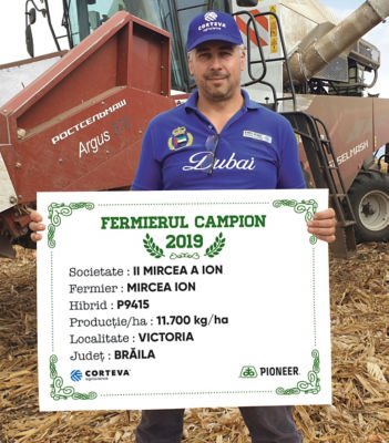 Ion Mircea din localitatea Victoria a semănat în acest an pentru prima oară hibridul P9415 și a obținut 11.700 kg/ha în irigat. “În acest an, planta premergătoare a fost tot porumbul, așa că în toamnă am fertilizat cu 220 kg/ha de îngrășământ 18.46.0 și apoi am arat. În primăvară am fertilizat cu sulfat - 140 kg/ha și azotat - 140 kg, terenul a fost pregătit cum combinatorul, iar în finalul celei de a doua săptămâni din luna aprilie am semănat. Cultura a primit și irigații în două tranșe și două erbicide în treceri separate, cam aceasta a fost tehnologia. Am recoltat în prima săptămână din septembrie, iar anul viitor voi semăna 75 ha cu porumb și voi alege hibrizii P9987 și P9415”, a declarat fermierul campion.