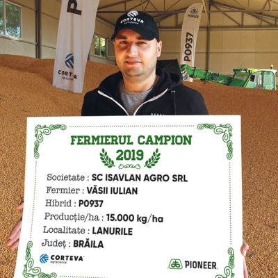 Iulian Văsii – administratorul fermei SC Isavlan Agro SRL în cadrul căreia se lucrează 300 ha, este unul dintre fermierii care au obținut rezultate foarte bune în ultimii ani cu hibrizii Pioneer®, iar în acest an, hibridul P0937 i-a oferit 15.000 kg/ha în irigat. “În acest an am avut 220 ha porumb, dintre care 80% hibrizi Pioneer® - P9911 tratat cu LumiGEN™ și P0937. Precipitațiile în cultura de porumb au fost de cca 180 mm/mp, însă la hibridul P0937 am mai intervenit cu două tranșe cu sistem linear de irigat a câte 15 mm/mp. Am fertilizat cultura cu 120 kg/ha de uree, pe care am încorporat-o în sol cu discul la finalul lunii februarie. Apoi, la semănat am aplicat 200 kg/ha de îngrășământ 20.20.0, iar în vegetație 220 kg/ha de azot, în două faze – prima în 6-7 frunze, am aplicat cu mașina de îngrășământ, iar în a doua faza am aplicat cu un prășitor. Consider că, una dintre principalele verigi tehnologice în cultura porumbului este combaterea buruienilor, așa că am aplicat Principal® Plus pentru a combate buruienile cu frunză lată și frunză îngustă. Anul viitor preconizez că voi folosi doar hibrizii Pioneer®, pentru că mi-au oferit o foarte bună stabilitate și rentabilitate. Cred că vor fi 250 ha cu porumb, pentru că îmi doresc ca în final să am o medie pe fermă, în irigat și neirigat, de 13.500 kg/ha. Am avut în cultură și hibridul P9911 tratat cu LumiGEN™, care a răsărit foarte bine, și pot spune că au o înrădăcinare foarte bună și nu-i dă șansa dăunătorului Tanymecus să distrugă cultura. Cu acest hibrid, în condiții de neirigat, am obținut 12.000 – 12.500 kg/ha”, a precizat fermierul campion.