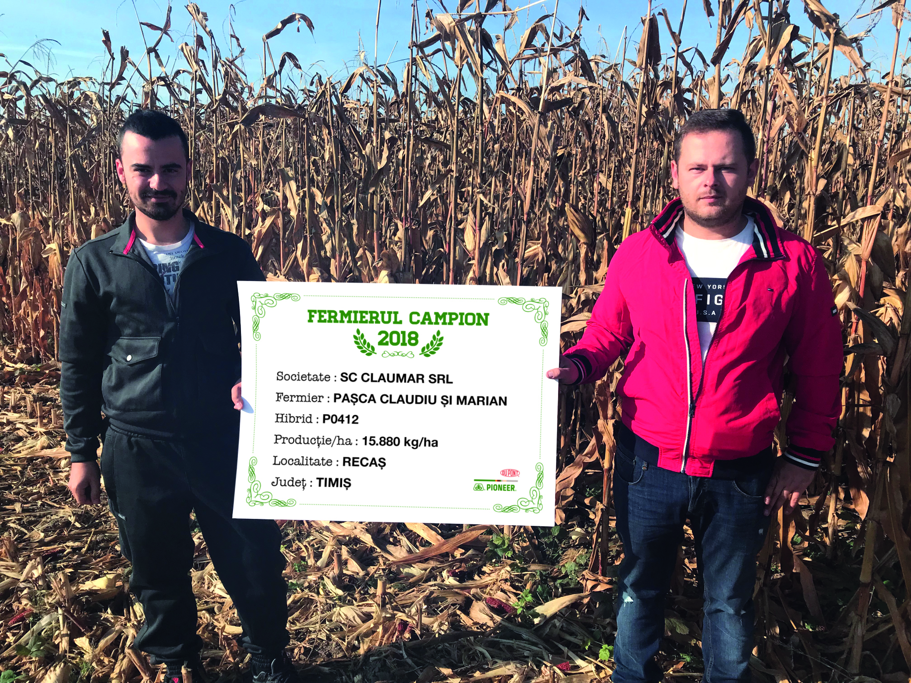 Claudiu și Marian Pașca lucrează în cadrul a 3 societăți 550 ha, anul trecut au avut 50 ha cu porumb, au semănat hibridul P0412 și au obținut 15.880 kg/ha. “Planta premergătoare a fost rapița, așa că după ce am recoltat-o am discuit, apoi în toamnă am arat la aproximativ 28 cm. În primăvară, am aruncat pe arătură sare potasică – 120 kg/ha, apoi am mai aplicat 220 kg/ha de uree, substanță brută, iar ca lucrări am intrat pe sol cu discul și freza. La semănat, în prima decadă a lunii aprilie, am semănat printre primii la noi în zonă, am optat pentru 56.000 b/g/ha și am aplicat îngrășământ complex 27.13,5.0 – 280 kg/ha. În faza de 4-6 frunze, când a mai plouat, am mai aplicat 220 kg/ha de azot. Am efectuat două treceri cu erbicide și am mai aplicat îngrășământ foliar cu zinc. Cultura nu a mai fost prășită pentru că s-a dezvoltat foarte repede și nu am mai avut cum să intrăm. Am început recoltatul încă din prima parte a lunii septembrie, dar parcela pe care am obținut 15.880 kg/ha a fost recoltată la finalul lunii. Anul acesta vom semăna 159 ha cu porumb, semănăm doar hibrizi Pioneer și am ales P0412, P9911, P9903, P0216, dar cel puțin un hibrid nou”, a declarat fermierul campion.
