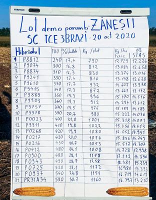 Lotul demonstrativ de la Zănești a cuprins în anul 2020 nu mai puțin de 21 de hibrizi de porumb. Mai mult decât atât, exact cum amintea și domnul Vasile Iacob, aici au fost aplicate și produse de protecția plantelor din portofoliul Corteva și după cum se poate observa din imagine, rezultatele obținute au fost foarte bune.