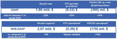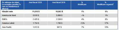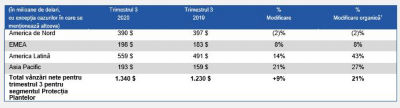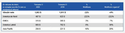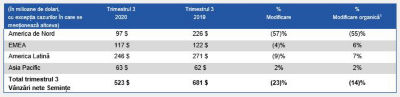 Pentru trimestrul 3 încheiat la data de 30 septembrie 2020, vânzările nete au scăzut cu 3% față de aceeași perioadă a anului anterior, în timp ce cresterea organica1 a fost de 9%.