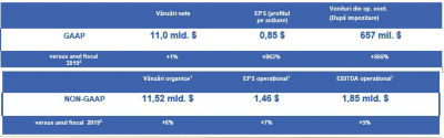 Această situație a câștigurilor include informații care nu se conformează cu U.S. GAAP și sunt considerate măsuri non-GAAP. Aceste măsuri includ cresteri organice (inclusiv în funcție de segment și regiune), EBITDA operațional, EBITDA operațional preliminar, marja EBITDA operațional, marja EBITDA preliminar operațional, câștiguri operaționale pe acțiune, câștiguri operaționale preliminare pe acțiune, rata impozitului de bază și rata preliminara a impozitului de bază. Conducerea folosește aceste măsuri intern pentru planificare și prognoză, inclusiv alocarea resurselor și evaluarea compensării stimulentelor. Conducerea crede că aceste măsuri non-GAAP reflectă cel mai bine performanța continuă a Companiei în perioadele prezentate și oferă informații mai relevante și mai utile pentru investitori, deoarece oferă o înțelegere a rezultatelor operaționale continue ale Companiei și o comparație mai utilă a rezultatelor de la an la an. Aceste măsuri non-GAAP completează dezvăluirile U.S. GAAP ale Companiei și nu trebuie privite ca o alternativă la măsurile U.S. GAAP de performanță. Mai mult, este posibil ca astfel de măsuri non-GAAP să nu fie conforme cu măsurile similare furnizate sau folosite de alte companii. Reconcilierile pentru aceste măsuri non-GAAP cu U.S. GAAP sunt furnizate în Informațiile Financiare Selectate și Măsurile Non-GAAP (Selected Financial Information and Non-GAAP Measures) începând cu pagina 6 a Anexelor cu Situațiile Financiare. Pentru primul trimestru și anul anterior acestuia, aceste măsuri non-GAAP sunt reconciliate cu o măsură financiară preliminară GAAP elaborată și prezentată conform Articolului 11 din Regulamentul S-X. A se vedea Articolul 11 din Situațiile Combinate Preliminare privind Operațiunile începând cu pagina A-17 a Anexelor cu Situațiile Financiare.