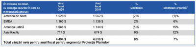În primele nouă luni ale anului 2020, pe segmentul de protecție a plantelor, vânzările nete au fost de 4,5 miliarde $, adică aproximativ aceleași cu cele înregistrate în primele nouă luni ale anului 2019. Creșterea de 5% a volumului și aceea de 2% a prețului local au compensat scăderea cu 6% a cursului de schimb și impactul negativ de 1% indus de micșorarea portofoliului de produse.