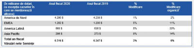 Impactul nefavorabil consolidat de 4% al variației cursului valutar s-a datorat în principal devalorizării Realului brazilian. In standardul de contabilitate GAAP, venitul, după aplicarea impozitului aferent, a fost de 657 de milioane $ pentru anul fiscal 2020. EBITDA operațional1 pentru perioada anului fiscal a fost de 1,8 miliarde $, însemnând, pe baza unor date preliminare, o creștere de 5% față de perioada corespunzătoare a anului anterior. Explicația constă în faptul că au existat câștiguri datorate atât creșterii volumelor vândute si unui mix adecvat de produse, cât și îmbunătățirii productivității, care au permis depașirea impactului nefavorabil al cursului de schimb.