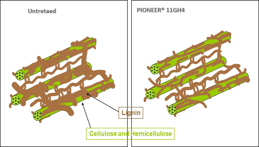 Lignina din pai este destructurată prin acțiunea enzimelor de ferulat-esterază eliberate de Pioneer® 11GH4. Acidul acetic eliberat în timpul însilozării îmbunătățește stabilitatea aerobă și tulpinile homofermentative prezente îmbunătățesc fermentarea prin producția de acid lactic.