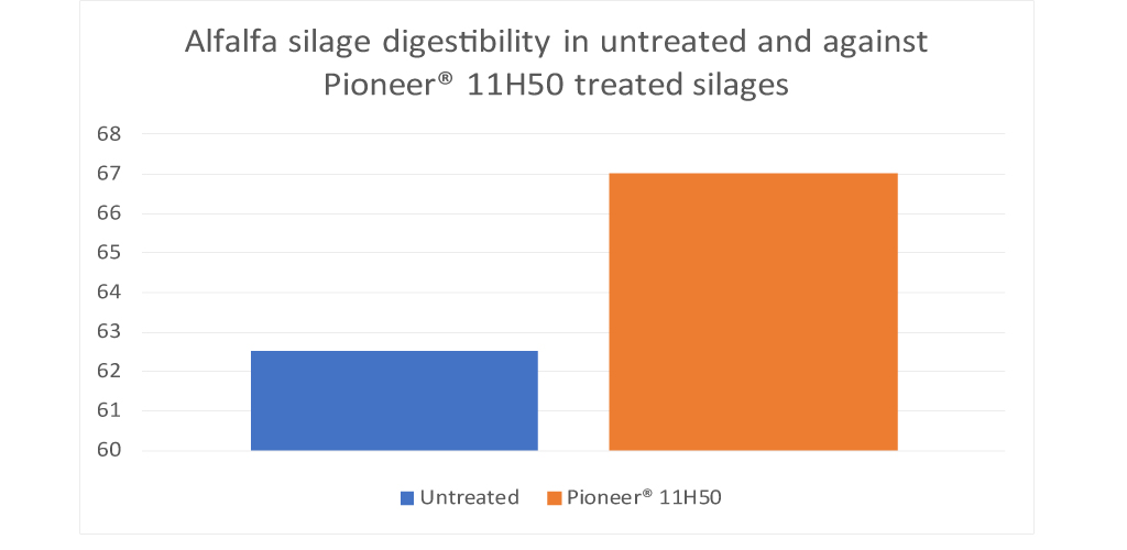 Pioneer® 11H50: Lucerna însilozată tratată cu Pioneer® 11H50 prezintă un nivel de pH scăzut rapid și semnificativ, acest lucru prevenind degradarea proteinei în amoniac (NH3)