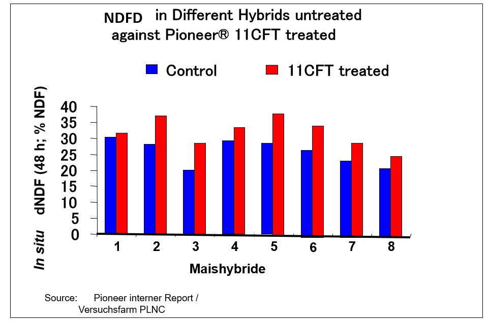 În comparație cu porumbul netratat pentru siloz, cel tratat cu PIONEER® 11CFT a arătat o îmbunătățire cu 7% a digestibilității fibrelor.