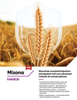 • Datorită concentrației ridicate de piraclostrobin, Mizona® combate eficient ruginile cerealelor, septorioza și are efecte pozitive asupra fiziologiei plantelor, stimulând producția și calitatea recoltelor.