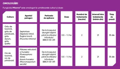 • Mizona® este omologat pentru grâu de toamnă, grâu de primăvară, grâu durum, grâu spelta, orz de toamnă și orz de primăvară, pentru combaterea bolilor precum septorioza (Zymoseptoria tritici), rugina brună (Puccinia triticina), pătarea reticulară (Pyrenophora teres), arsura frunzelor (Rhynchosporium secalis).