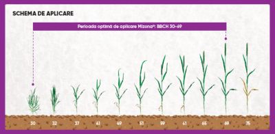 • Perioada optimă de aplicare este BBCH 30-69 de la începutul alungirii tulpinii până la sfârșitul înfloritului.