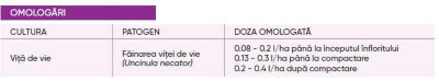 • Pentru struguri de vin tratamentele se pot aplica în fazele de pre și post înflorire, la un interval de 12-14 zile între tratamente, în funcție de presiunea bolii și dezvoltarea culturii.