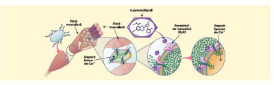 • Contracția musculară necesită o eliberare regulată de calciu din stocurile intracelulare în citoplasma celulelor. Cu toate acestea, moleculele de cyantraniliprol se leagă de RyRs, cauzând o eliberare necontrolată de calciu. Acest lucru duce la stoparea contractării musculare și împiedică insectele să se hrănească.