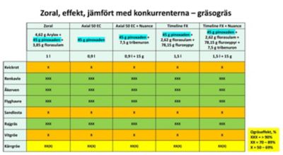 Nedan visas en jämförelsetabell över effekten på örtogräs för Zoral och andra produkter på den svenska marknaden som innehåller pinoxaden. För att göra jämförelsen så rättvis som möjligt är alla preparat satta till en dos motsvarande 45 g pinoxaden.