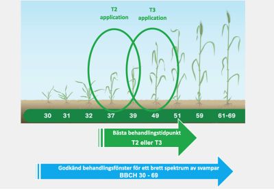 | Vete efter vete, känslig sort, enkelbehandling och högt sjukdomstryck | 1,2 - 1,5 l/ha |