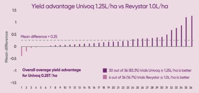 I 83% av försöken uppnådde Univoq en högre skörd än 1.0 l Revystar