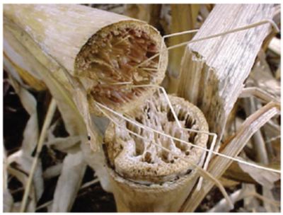 · Köklerde, destek köklerinde ve alt boğumlarda çürüme meydana gelir. Sap enine kesildiğinde iç sap açık pembe ile ten rengi bir renk değişikliği gösterir ancak sapın içinde veya üzerinde siyah benekler yoktur. Sap parçalanır fakat iletim demetleri sağlam kalır (Şekil 1). Saplar sıkıldığında süngerimsi bir his verir ve alt boğumlar kolayca ezilebilir veya kıvrılabilir. Bitkiler yana doğru itildiğinde veya rüzgârdan etkilendiğinde yatabilirler. Fusarium Gibberella’ya benzeyebilir ve iç sap rengiyle ayırt edilir; Fusarium beyaz/pembe/somon rengi; Gibberella kırmızı/pembe rengindedir.(Şekil 2).