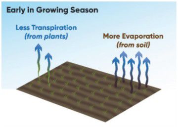 Büyüme dönemi başlarında küçük bitkilerin transpirasyonuna (terleme) kıyasla daha fazla su evaporasyon (buharlaşma) yoluyla toprağı terk eder.