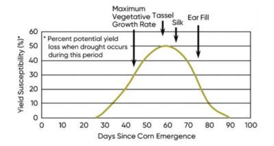 Su stresinin mısır tane verimi üzerindeki etkisi, bitkinin büyüme evresine göre değişir (Şekil 3). Mısır, su talebi nispeten düşük olduğu için erken vejetatif büyüme sırasında su eksikliklerine az duyarlıdır. Bitkiler tane verimi üzerindeki etkisini azaltmak için vejetatif dönem boyunca su stresine uyum sağlayabilir; bununla birlikte mısır çiçeklenmeden tane dolumuna kadar su stresine karşı çok daha hassastır. Mısır hibritleri su stresine dayanma yeteneklerine göre değişir. Pioneer® marka Optimum® AQUAmax® hibritleri kurak koşullara dayanmaya ve verim kaybına karşı dayanım sağlamaya yönelik ıslah edilmiş temel doğal özellikleri içerir.