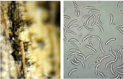 Şekil 3: Solda-El merceği kullanılarak sap yüzeyinde görünen tüyler, Sağda-Mikroskop altında görünen kavisli antraknoz sporları