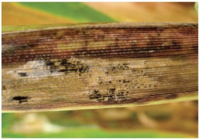 Şekil 1: Gibberella sap çürüklüğü ile enfekte mısır sapı. Bitki dokusundaki siyah perithecia'ya dikkat edilmeli. Hastalık, kışı mısır kalıntılarında perithecia olarak geçirir. Sporlar yağışlı havalarda perithecia ve misel üzerinde çoğalırlar.