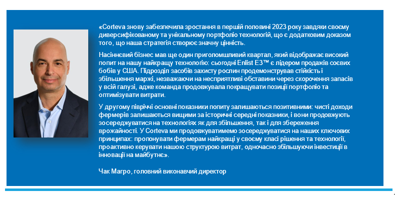 Corteva, Inc. (NYSE: CTVA) («Corteva» або «Компанія») представила фінансові результати за другий квартал та шість місяців, що закінчились 30 червня 2023 р.