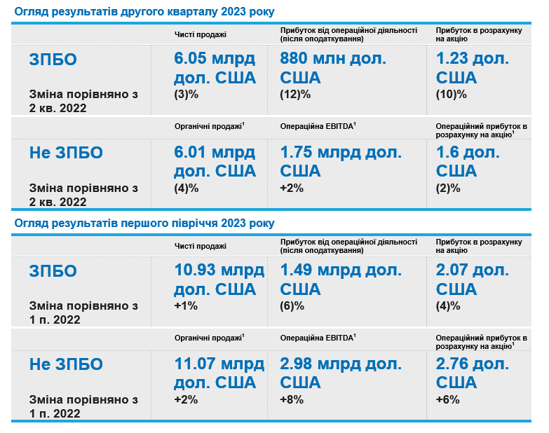 • Дохід по ЗПБО та прибуток на акцію (EPS) від діяльності, що триває, склали 1,49 млрд дол. США та 2,07 дол. США за акцію у першому півріччі 2023 року відповідно, із зменшенням порівняно з минулим роком через скорочення обсягів, несприятливий вплив курсових коливань та безготівкові витрати, пов’язані з планами на пенсійне забезпечення. Операційний показник EBITDA1 склав 2,98 млрд дол. США, що на 8% більше, ніж в попередньому році, завдяки ефективному ціноутворенню та ініціативам з підвищення продуктивності, що було частково нівельоване меншими обсягами, витратами та несприятливими валютними коливаннями. Операційний прибуток на акцію1 становив 2,76 дол. США, що на 6% більше, ніж в попередньому році.
