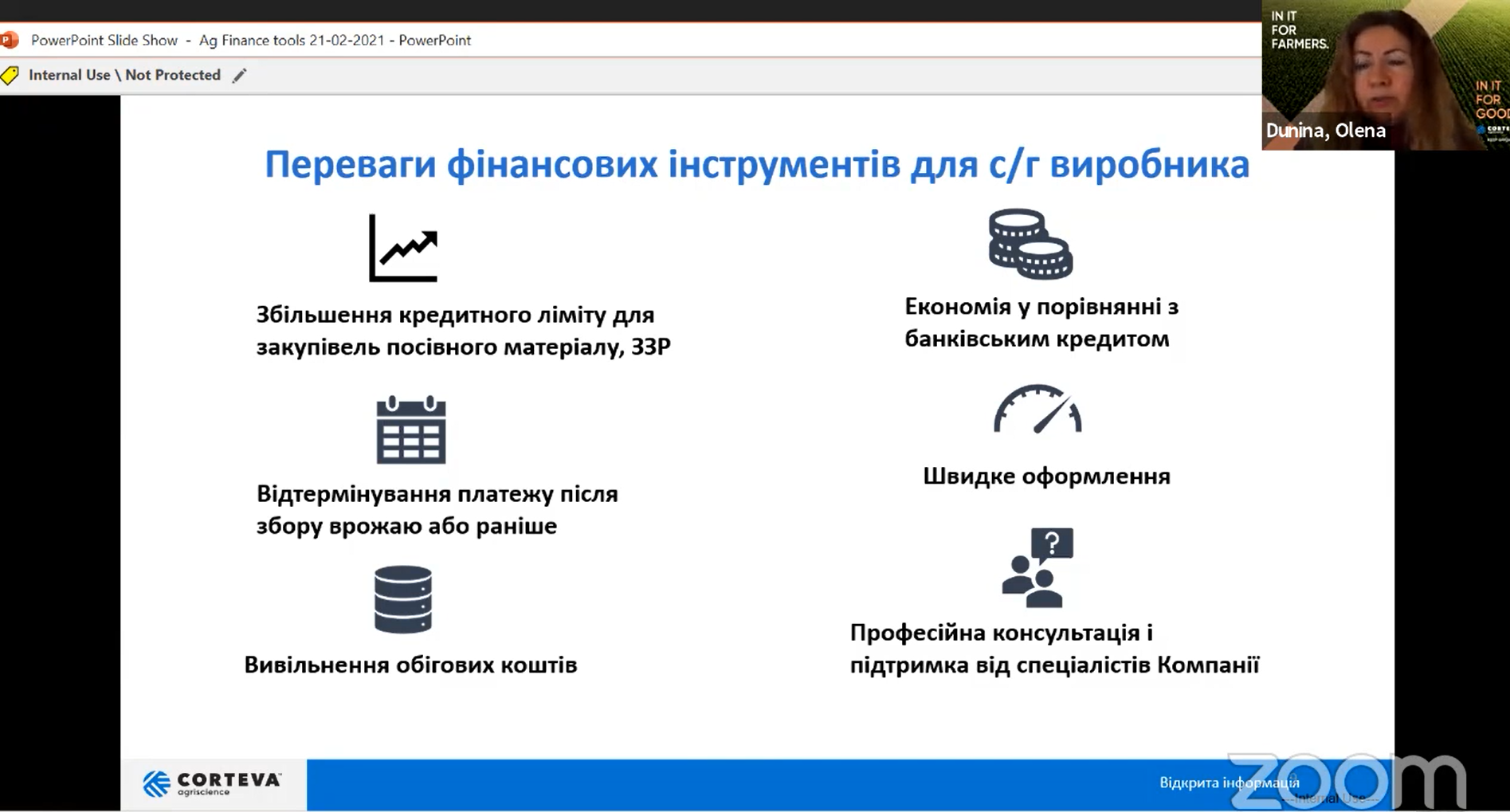 За словами Олени Дуніної, сезон 2020/2021 почався набагато раніше, ніж зазвичай. Фермери намагалися купити насіння та засоби захисту у першій половині осені, хоча зазвичай пік продажів наступав пізніше. «Були суттєві побоювання щодо курсу національної валюти та люди намагалися забезпечити себе на майбутню посівну якомога раніше, - говорить фінансовий керівник. – І Corteva завдяки низці інструментів змогла забезпечити сільгоспвиробників можливістю для своєчасного придбання преміального насіння та інноваційних ЗЗР».