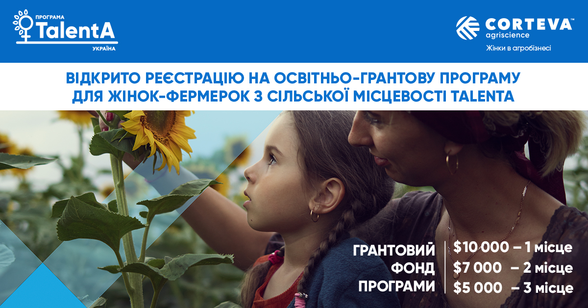 9 березня 2021 року розпочинається реєстрація учасниць на освітньо-грантову програму для жінок-фермерок TalentA, засновану за ініціативи та фінансування міжнародної сільськогосподарської науково-дослідницької компанії Corteva Agriscience. Програма реалізується за підтримки Міністерства розвитку економіки, торгівлі та сільського господарства України, Фонду ООН у галузі народонаселення, Центру «Розвиток Корпоративної Соціальної Відповідальності» та Громадської організації «Всеукраїнська Рада жінок-фермерок». Реєстрація на програму триватиме до 11 квітня 2021 року.