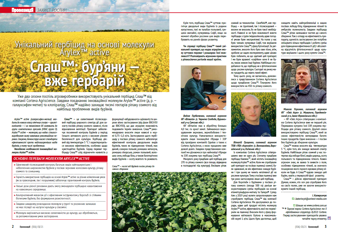 Уже два сезони поспіль агровиробники використовують унікальний гербіцид Слаш™ від компанії Corteva Agriscience. Завдяки поєднанню інноваційної молекули Arylex™ active (д. р. — галауксифен-метил) та клопіраліду, Слаш™ надійно захищає тисячі гектарів ріпаку озимого від найбільш проблемних видів бур’янів.