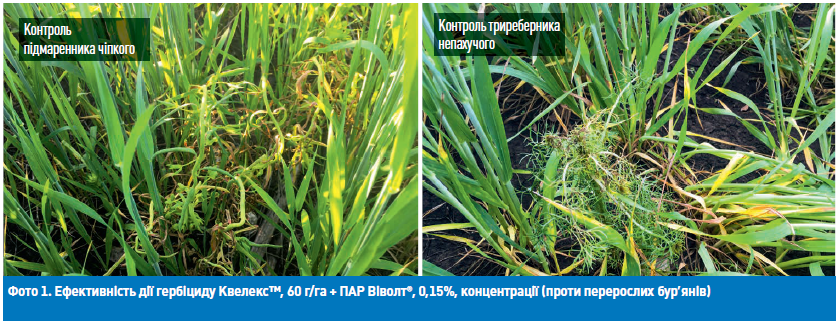 Що ж до амброзії, то вона з’являється на полі пізно і може швидко перерости оптимальний строк для її контролю. У разі пізньої вегетації амброзії полинолистої варто використовувати гербіцид Квелекс™ у нормі 60 г/га з прилипачем Віволт®. Ефективність Квелекс™ проти амброзії сягає 95–99%. Також цей препарат вирізняється чудовою селективністю як до пшениці озимої, так і до ячменю.